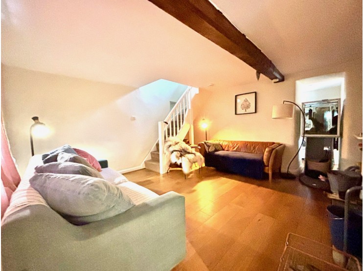 Sitting room – 4.90m x 4.28m (16’ 1” x 14’) accessed off the hall and also via the ktichen. The cosy room features a single ceiling beam, modern oak plank flooring, an exposed stone lintel and raised hearth to the chimney breast and which sites the cast iron solid fuel stove.