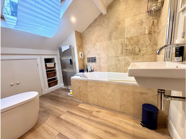 Bathroom – 2.16m x 2.06m (7’ 1” x 6’ 9”) fitted with a modern white suite to include panelled bath with overhead shower and glazed screen, wall hung wash hand basin, WC. There is a Velux roof light, chromed ladder radiator and access to eaves storage.