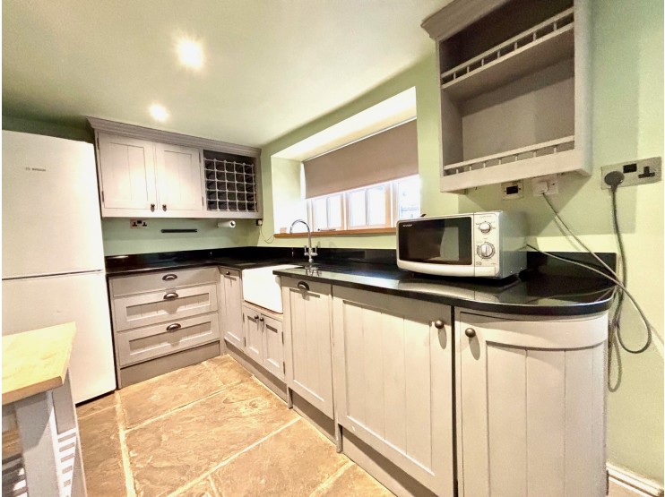 Kitchen – 4.33m x 2.09m (14’ 2” x 6’ 10”) fitted with a range of modern hand painted cupboards and drawers complemented by black granite work surfaces, which are set around a Belfast style sink, with integrated dishwasher and washing machine. There is a feature stone fireplace with a tiled inset, which stands as a splash back to the cooker position, fridge freezer, flagged stone floor, multi paned double glazed window and similar half glazed door providing access to the rear patio garden.
