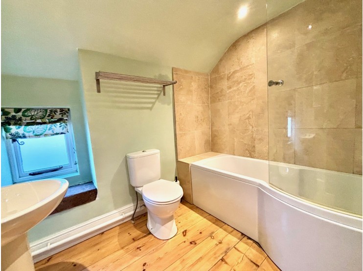 Bathroom – 2.43m x 2.09m (8’ x 6’ 10”) fitted with a modern white suite to include a pedestal wash hand basin, low flush WC and a shaped bath with curved glazed shower screen and Victorian style mixer shower taps. There is complementary natural splash back tiling, contemporary towel radiator and a stripped pine boarded floor.