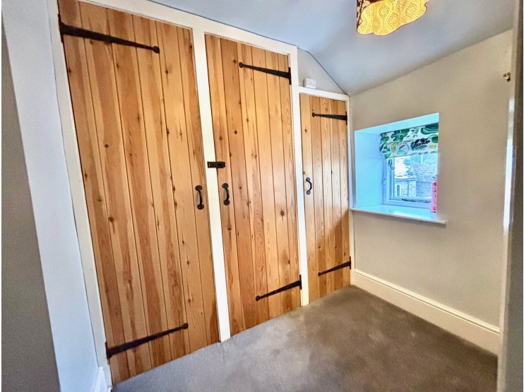 From the sitting room, stairs rise to the first floor landing, to which there is a range of useful built-in storage cupboards, one housing the gas fired combination boiler serving the central heating and hot water system. There is a single ceiling beam, window to the rear and pine cottage doors leading to…