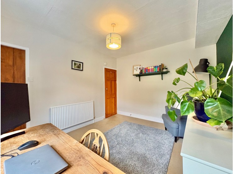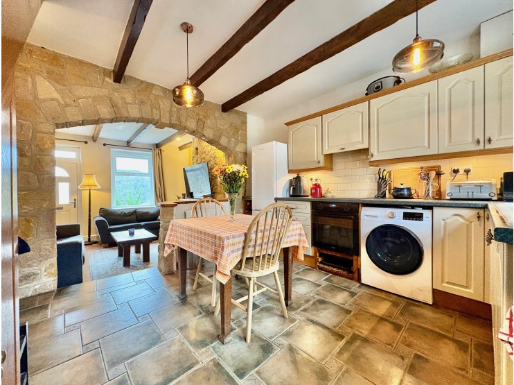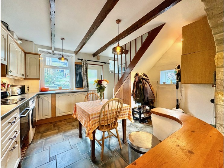 Dining kitchen – 3.94m x 3.62m (12’ 11” x 11’ 11”) a generous room fitted with a range of cupboards, drawers and work surfaces which incorporate a white pot sink and induction hob with fitted extractor over. There is an under counter oven, space and plumbing for an automatic washing machine and other appliance space. Again, there are ceiling beams, a window facing the rear, smaller window at the bottom of the stairs, another to the side of the property, and uPVC door allowing external access to the rear.