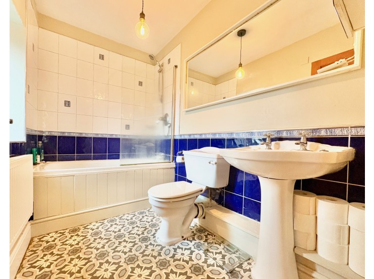 Bathroom – fitted with a white suite comprising bath with mains shower over and glazed screen, pedestal wash hand basin and WC. Side facing window.