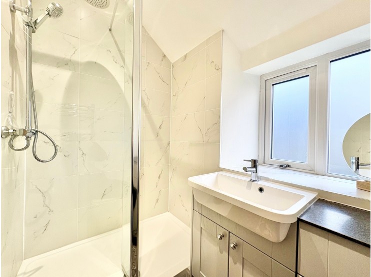 Ensuite shower room – 2.06m x 1.48m (6’ 9” x 4’ 10”) fitted with a glazed shower cubicle with mains drench shower fitting and handheld spray, wash hand basin set to a useful cabinet below and vanity space above and WC with fitted cistern. Chromed ladder radiator and rear facing window.