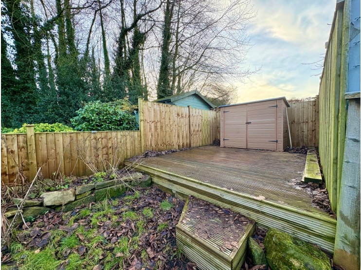 The larger than expected gardens lie to the rear of the property and are accessed from the front via a wooden pedestrian gate. The gardens are slightly raised from the house and are laid to lawn with border planting and central pathway which leads to a decked area, ideal for outdoor entertaining and with ample room for a shed. The gardens, which back onto trees and countryside, so have a degree of privacy, offer ample opportunity for further landscaping as may be desired.